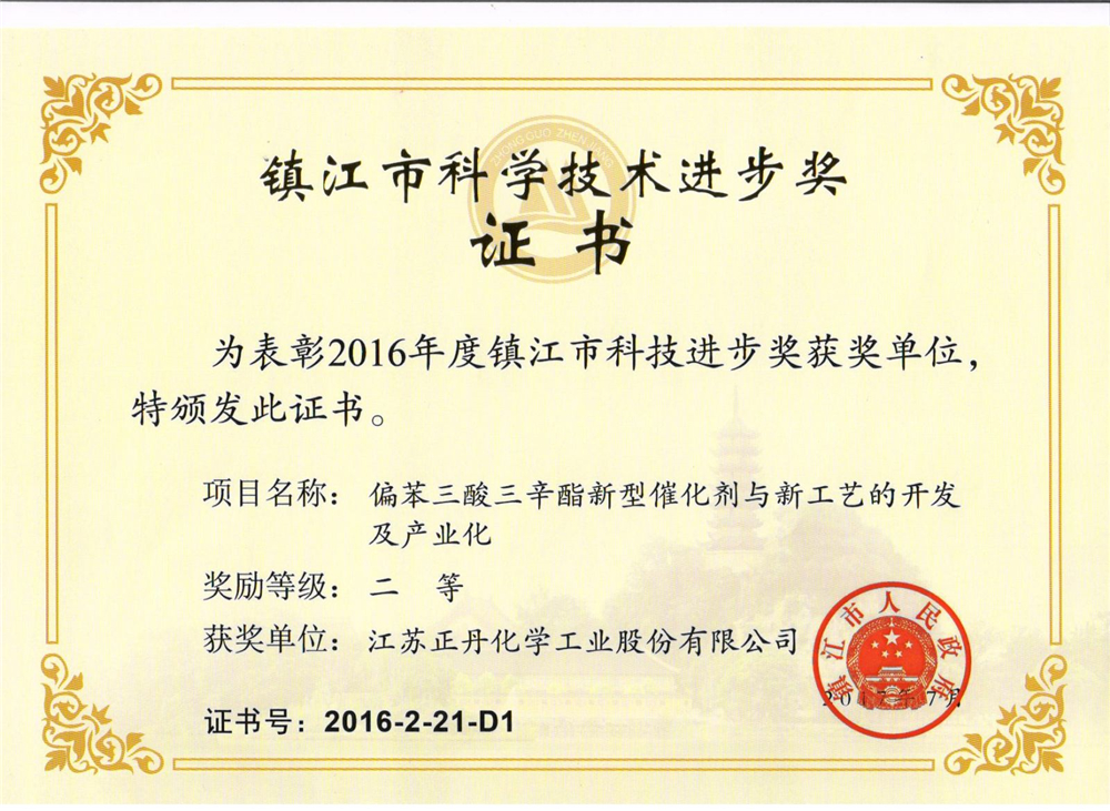 江苏和记AG(Asia Gaming)化学工业股份有限公司作为国内主要的偏苯三酸三辛酯生产企业,一直致力于偏苯三酸三辛酯生产技术的改进和工艺优化,提高企业核心竞争力。公司组织科研技术力量,经过不懈努力、反复攻关,实现了一种绿色催化合成偏苯三酸三辛酯的新工艺,并形成多项自主知识产权(获得国家授权发明专利2项,实用新型专利1项)。公司将专利技术进行成果转化,成功实施“偏苯三酸三辛酯新型催化剂与新工艺的开发及产业化”项目并获得“2016年度镇江市科学技术进步奖 二等奖”。