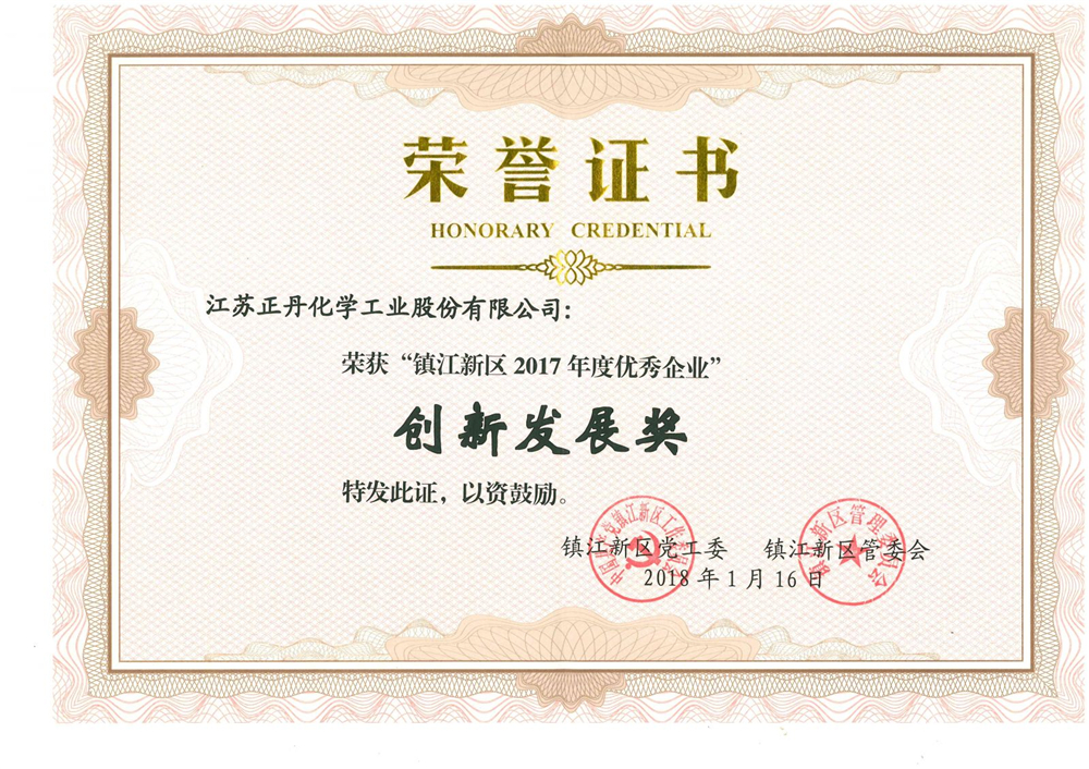 2017年度,我司申请多项发明及实用新型专利,其中“一种乙烯基甲苯生产过程中的急冷器”实用新型专利获得授权;“偏苯三酸三辛酯新型催化剂与新工艺的开发及产业化”项目荣获“镇江市科技进步奖”二等奖,与江苏大学合作完成的“功能金属基配合物材料在化工新材料领域的应用及产业化”项目获得“中国产学研合作创新成果奖”二等奖等。