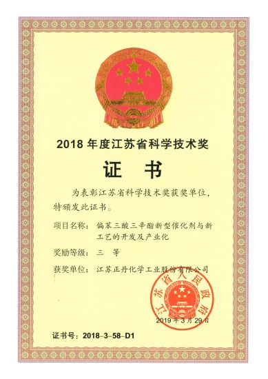 近日,公司自主研发项目“偏苯三酸三辛酯新型催化剂与新工艺的开发及产业化”荣获江苏省科学技术三等奖。